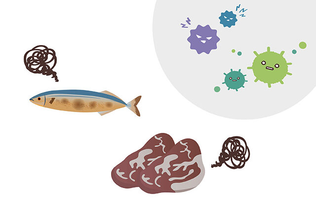 一方の腐敗は、微生物によって食品が分解される過程で「不快な臭い」や「有害な物質」が発生する状態をいいます。魚が時間とともに生臭くなる、肉がねばついて嫌なにおいを放つといった現象は腐敗の典型例です。腐敗は食品の安全性を低下させ、食中毒の原因になることもあります。