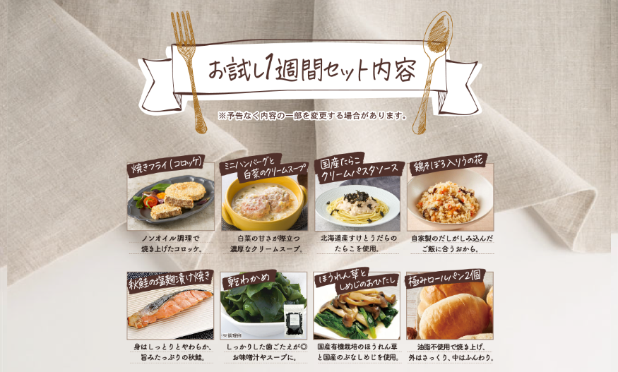 その中でも気軽に始められるのが、今回ご紹介する【お試し1週間献立セット】。まずは1週間、無理なく続けられる食生活を体験してみてください。