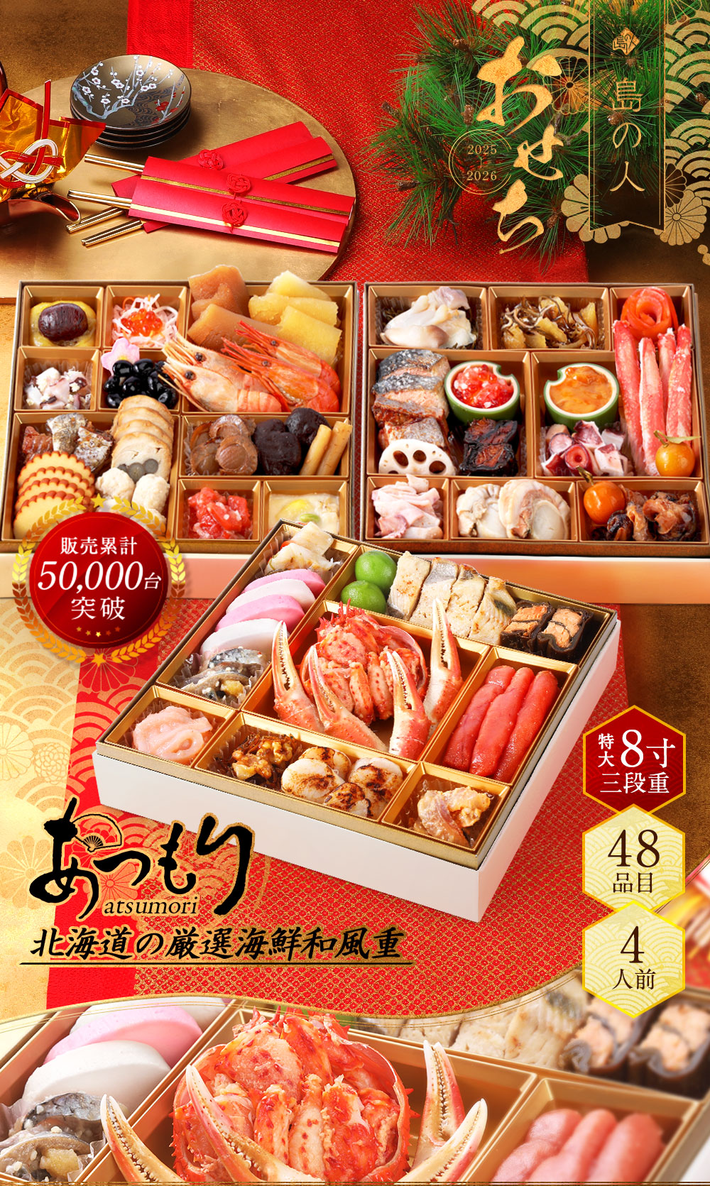 一番人気の豪華海鮮おせち(リリース初日で楽天デイリーおせちランキング1位の実績)。北海道素材にこだわり、上品な味付けとなっています。