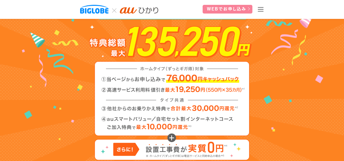 • キャッシュバック最大76,000円:お申し込み後の条件達成で受け取れる現金還元。