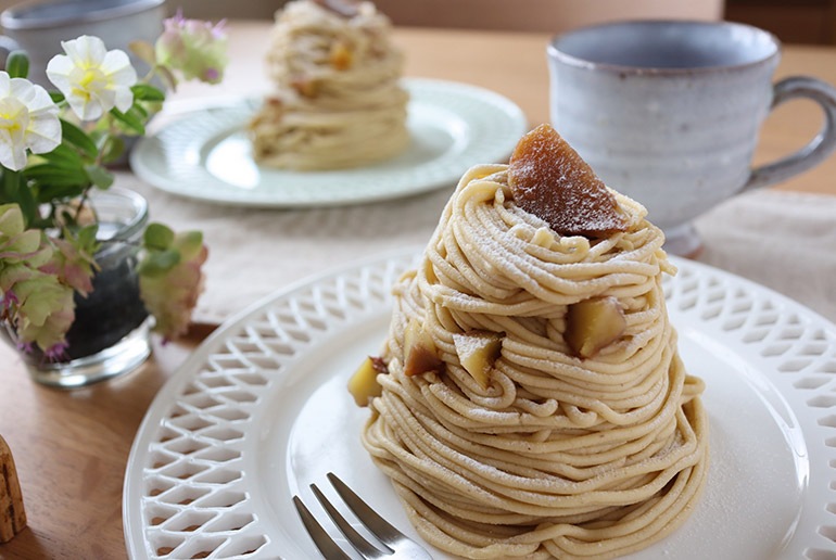 市販のスポンジケーキやタルト台に生クリームを絞り、その上から茜丸の「栗きんとんあん」を絞り袋に入れてデコレーション。裏ごしの手間なく、本格的なモンブランの味わいが楽しめます。