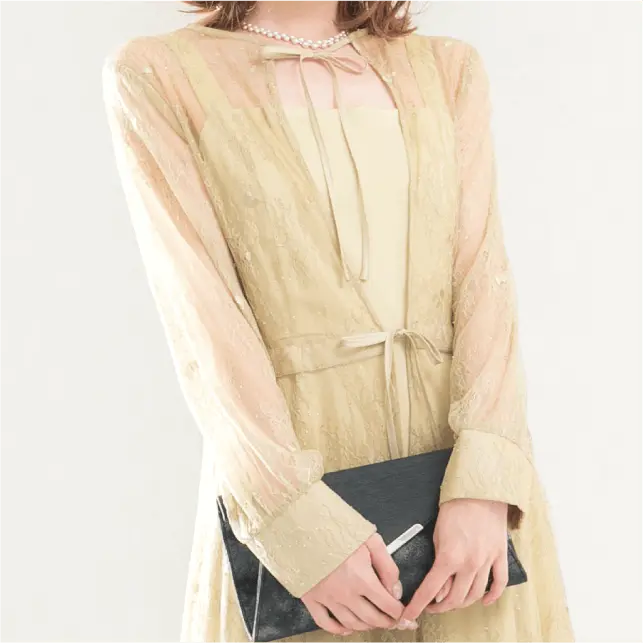 リリアージュで特に人気なのが、プロのスタイリストがコーディネートした「ドレス・羽織り・ネックレス・バッグ」の4点セットや3点セットです。届いたものをそのまま着るだけで、マナーも流行も押さえた完璧なスタイルが完成します。