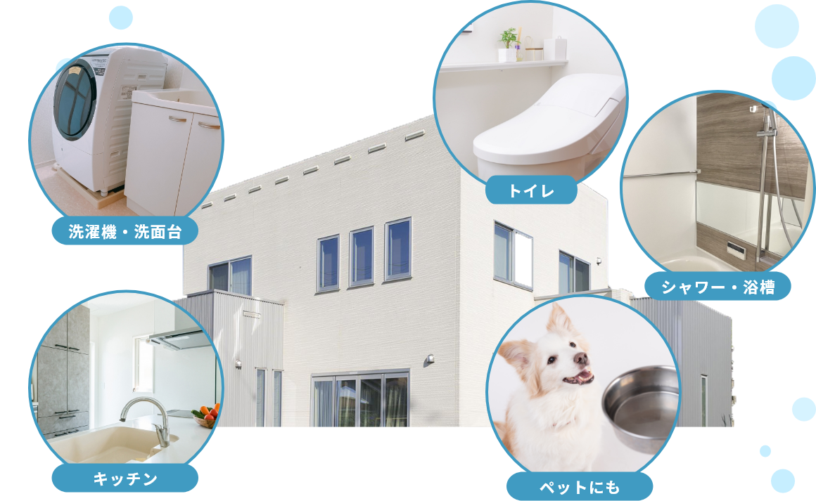 キッチン、洗面所、お風呂、トイレ、庭の散水栓まで、すべての水が変わります。ペットのシャンプーも、庭の水やりも、すべてが高機能な水で行えます。