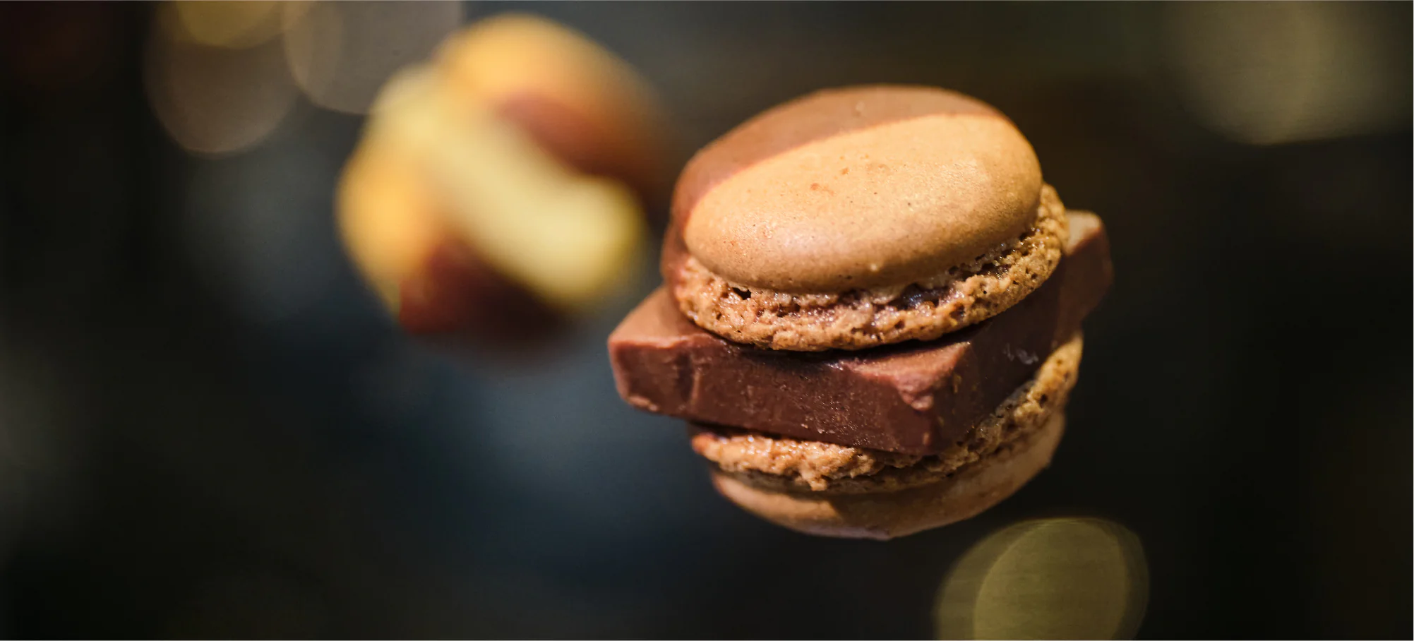 - ねっちり食感のマカロン生地(コック): 外側は繊細で薄い焼き目、内側は密度が高くねっとりとした食感。一般的なマカロンの「サクッ」とした後に来る「ねっちり感」を極限まで高めています。
