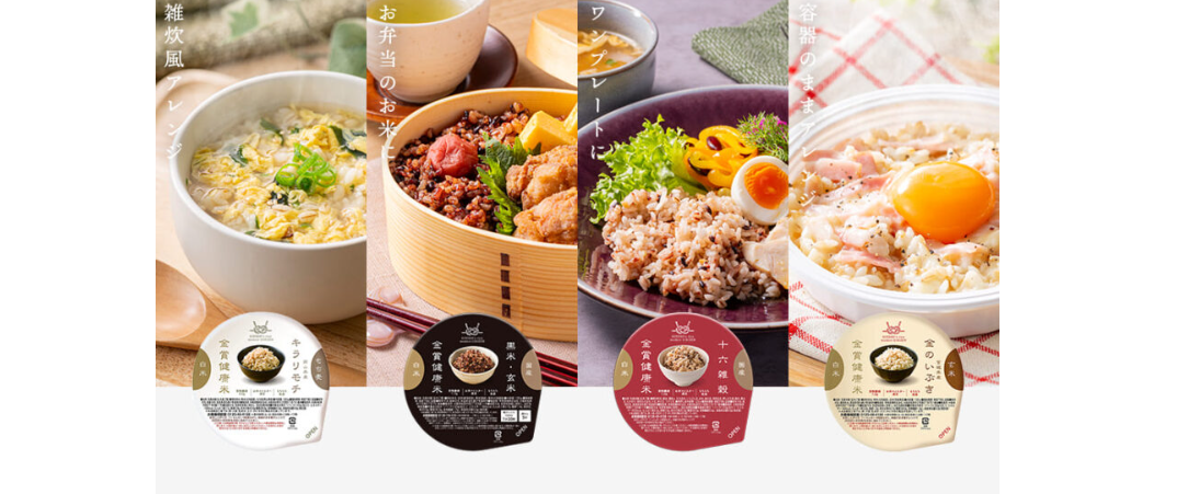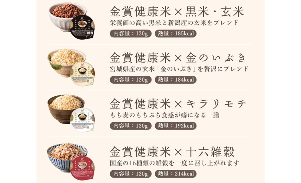 「金賞の一膳」の最大の特徴は、その日の体調や気分、おかずに合わせて選べる4つのバリエーションにあります。すべて国産原料を使用しており、品質への妥協はありません。
