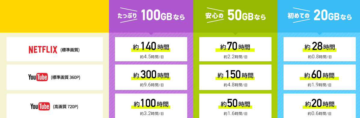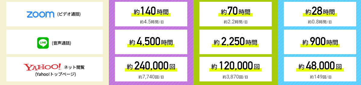 各プランで設定された月間データ容量(20GB、50GB、100GBなど)の範囲内であれば、いつでも快適な速度で通信が可能です。週末にまとめて動画を楽しんだり、長時間のオンライン会議が続いたりしても、制限を気にする必要はありません。
